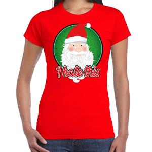 Fout Kerst T-shirt I hate this rood voor dames. Dit Kerst shirt / t-shirt is bedrukt met de afbeelding van de kerstman met bedenkelijke blik en de tekst: I hate this. Dit kerstshirt / t-shirt is leuk om te dragen tijdens een kerstborrel of bij het gourmetten. Materiaal: 100% katoen, 145 grams kwaliteit.Let op: dit artikel valt klein, we adviseren om 1 maat groter te bestellen.